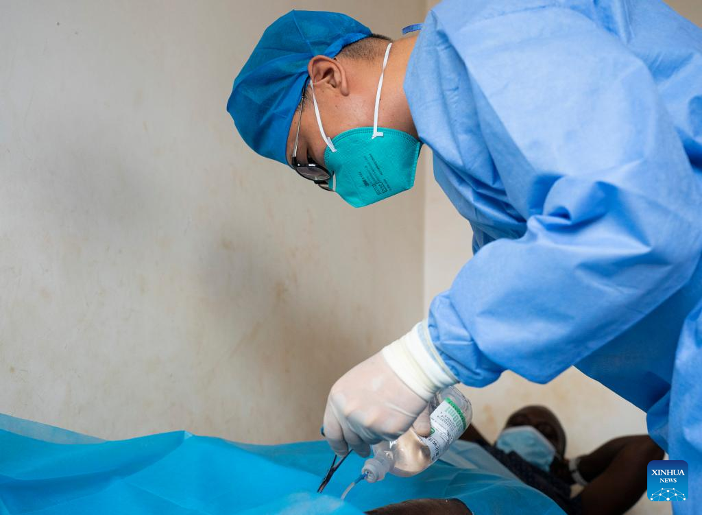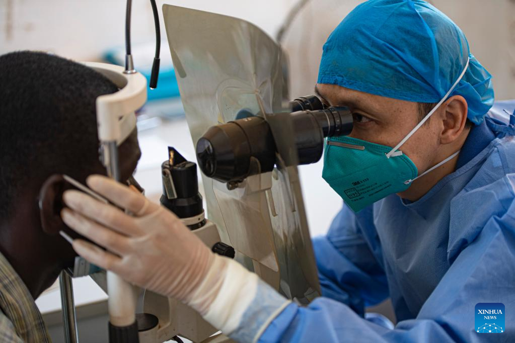 Zhang Youmei, a member of the 19th Chinese medical team dispatched to the Central African Republic, examines a patient at the Hospital of Friendship in Bangui, Central African Republic, Feb. 13, 2023. The 19th Chinese medical team dispatched to the Central African Republic arrived in the country in June 2022. Since then, team members have been on China's international medical aid mission here, providing services for local people. (Xinhua/Li Yahui)