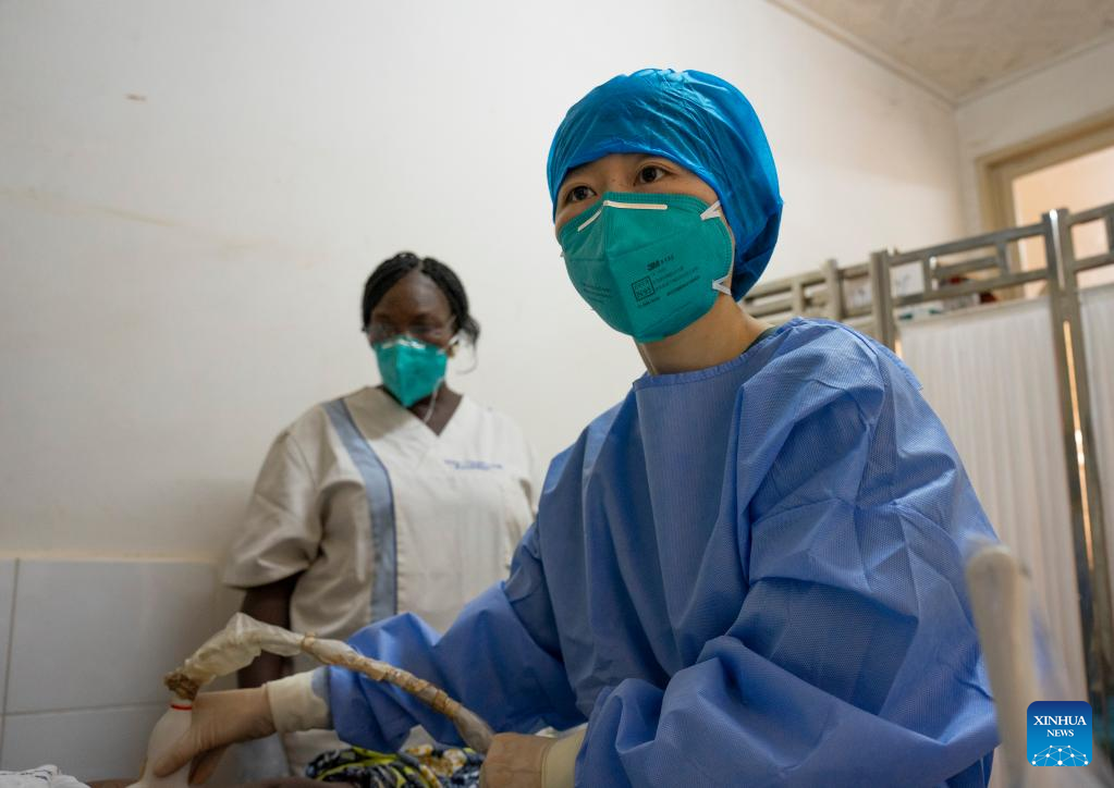 Xu Yan, a member of the 19th Chinese medical team dispatched to the Central African Republic, change a wound dressing for a patient at a hospital in Bangui, Central African Republic, Feb. 13, 2023. The 19th Chinese medical team dispatched to the Central African Republic arrived in the country in June 2022. Since then, team members have been on China's international medical aid mission here, providing services for local people. (Xinhua/Li Yahui)