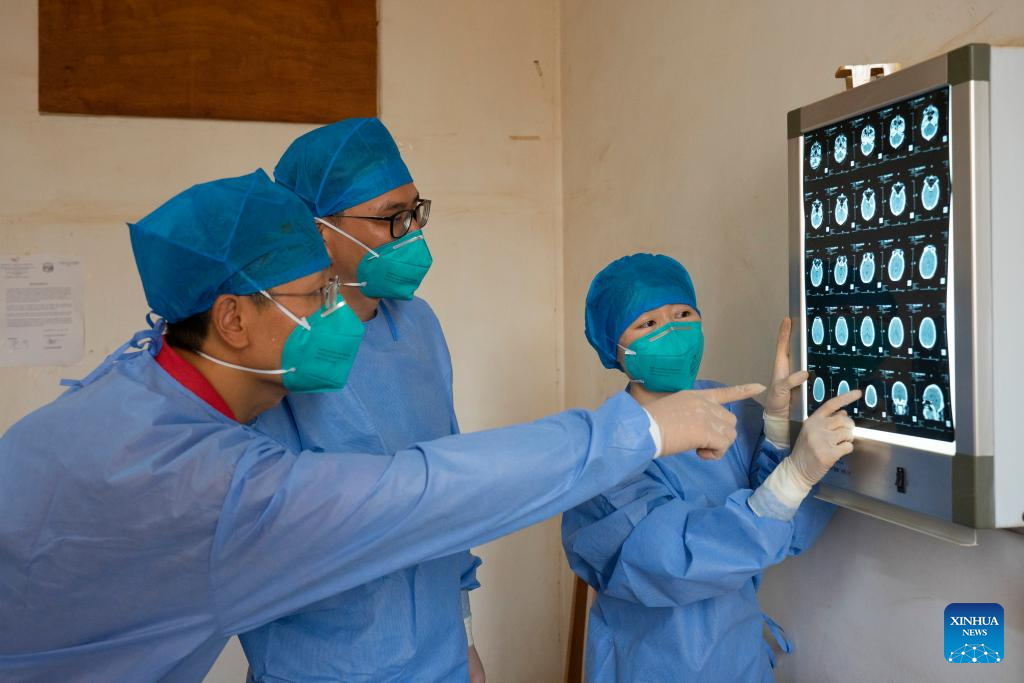 Members of the 19th Chinese medical team dispatched to the Central African Republic Wang Baoxiang (L), Wang Jia (R) and Xu Yan work at the Hospital of Friendship in Bangui, Central African Republic, Feb. 14, 2023. The 19th Chinese medical team dispatched to the Central African Republic arrived in the country in June 2022. Since then, team members have been on China's international medical aid mission here, providing services for local people. (Xinhua/Li Yahui)