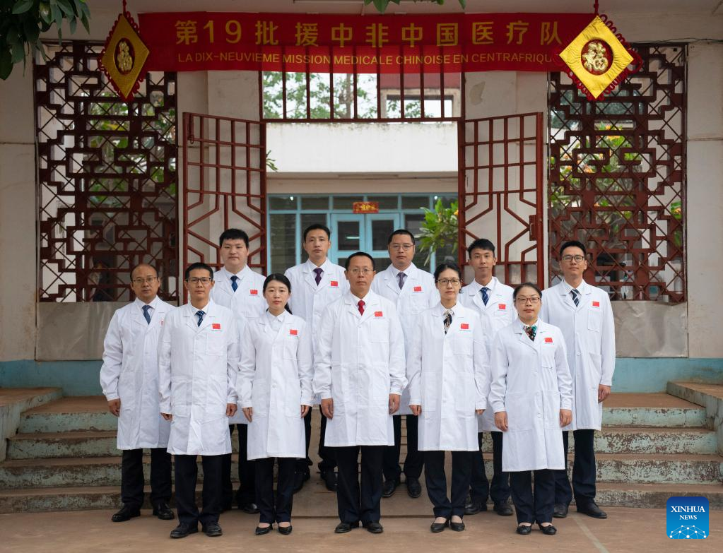 Members of the 19th Chinese medical team dispatched to the Central African Republic pose for a group photo in Bangui, Central African Republic, Feb. 14, 2023. The 19th Chinese medical team dispatched to the Central African Republic arrived in the country in June 2022. Since then, team members have been on China's international medical aid mission here, providing services for local people. (Xinhua/Li Yahui)