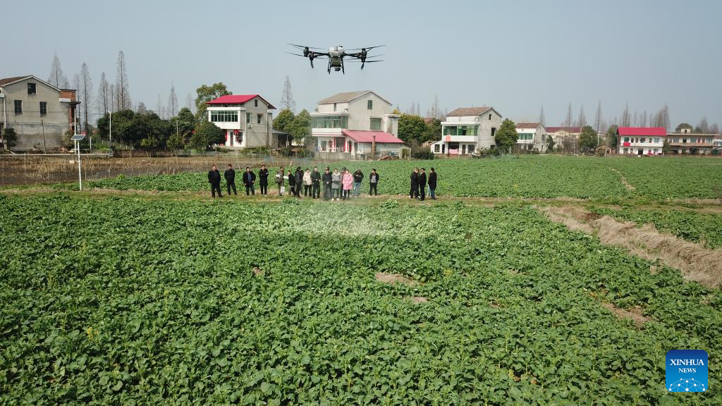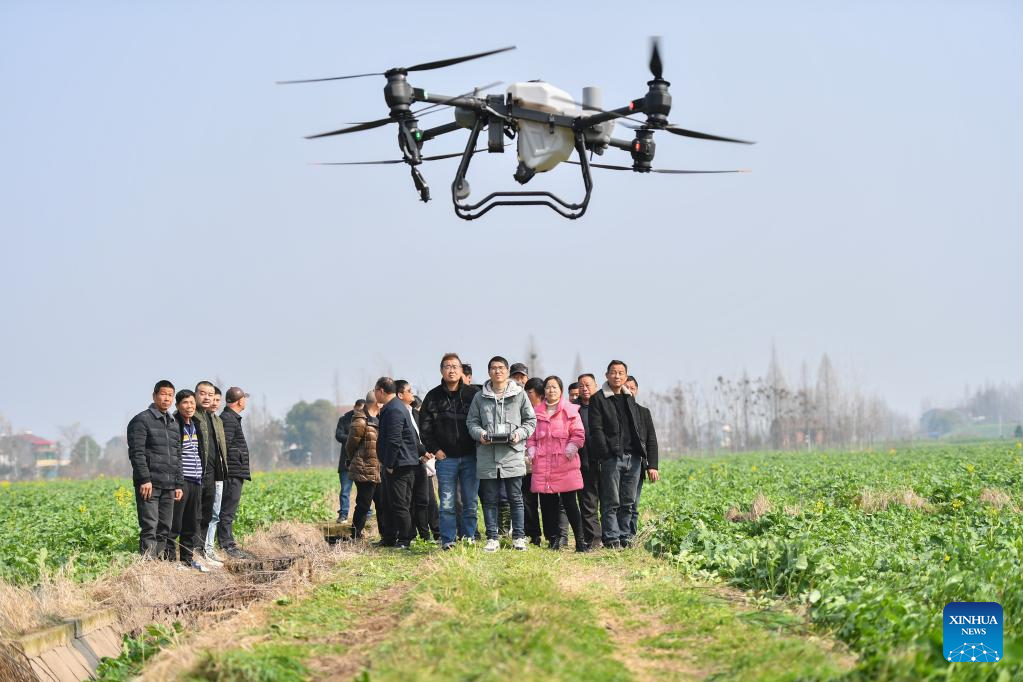Trainees watch a drone takeoff demonstration in the field in Fu'an Village of Gonghua Town in Yuanjiang, central China's Hunan Province, Feb. 15, 2023. Fu'an Village conducted a drone operation training on Wednesday for local villagers to prepare for the spring ploughing. (Xinhua/Chen Zeguo)