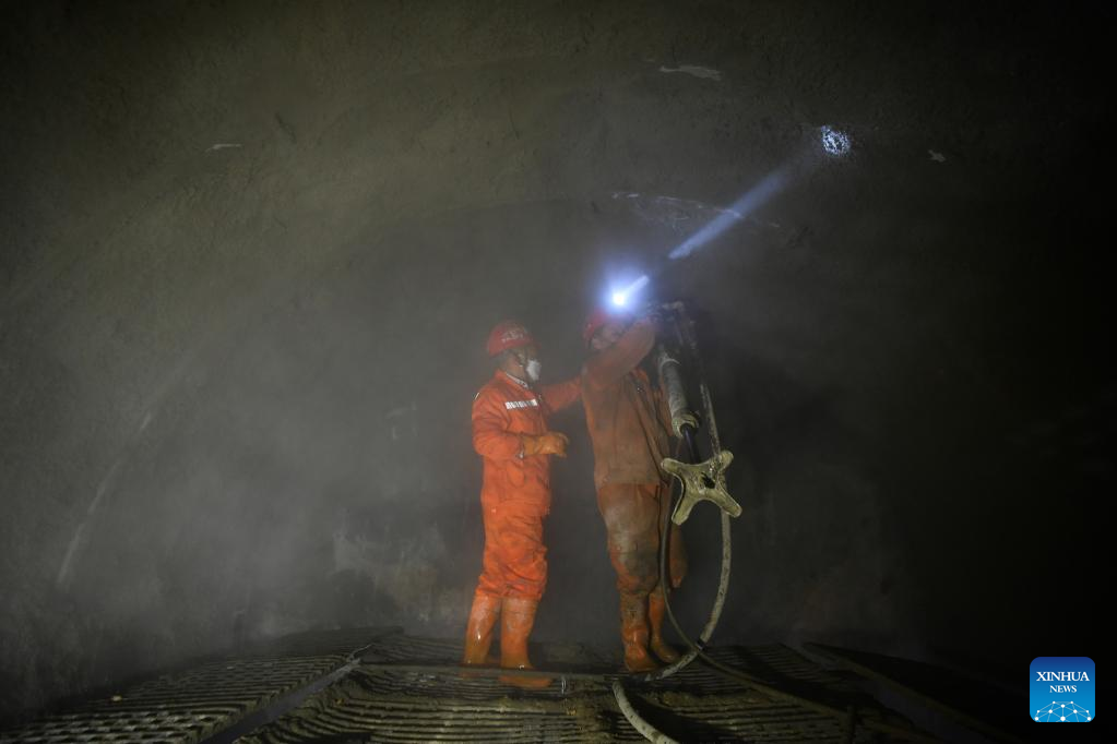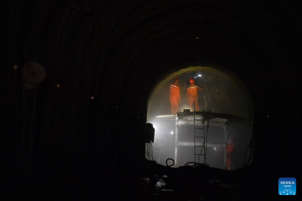 Workers operate at the construction site of a tunnel for the Shaanxi section of the third West-to-East natural gas pipeline in Shangzhou District, Shangluo City of northwest China's Shaanxi Province, Feb. 7, 2023. China's west-to-east gas transmission project has boosted natural gas supply across the country and facilitated the low-carbon transformation of the country's energy consumption structure. (Xinhua/Zhang Bowen)