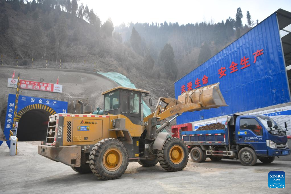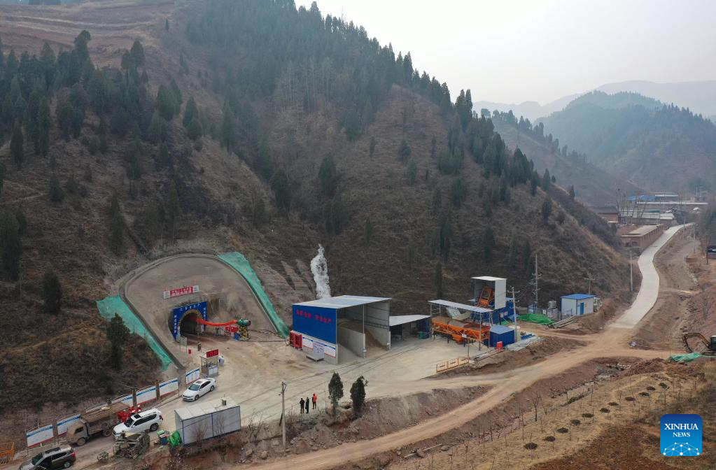 This aerial photo taken on Feb. 7, 2023 shows a view of the construction site of a tunnel for the Shaanxi section of the third West-to-East natural gas pipeline in Shangzhou District, Shangluo City of northwest China's Shaanxi Province. China's west-to-east gas transmission project has boosted natural gas supply across the country and facilitated the low-carbon transformation of the country's energy consumption structure. (Xinhua/Zhang Bowen)
