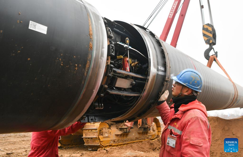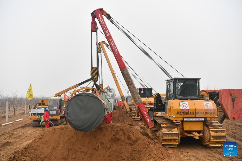 Workers operate at a construction site of the Shaanxi section of the third West-to-East natural gas pipeline in Liquan County, Xianyang City of northwest China's Shaanxi Province, Feb. 16, 2023. China's west-to-east gas transmission project has boosted natural gas supply across the country and facilitated the low-carbon transformation of the country's energy consumption structure. (Xinhua/Zhang Bowen)