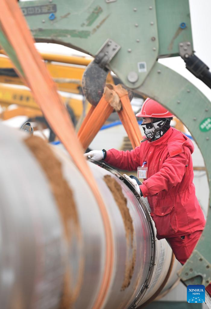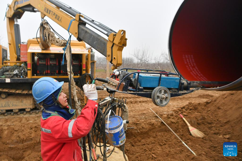A worker operates at a construction site of the Shaanxi section of the third West-to-East natural gas pipeline in Liquan County, Xianyang City of northwest China's Shaanxi Province, Feb. 16, 2023. China's west-to-east gas transmission project has boosted natural gas supply across the country and facilitated the low-carbon transformation of the country's energy consumption structure. (Xinhua/Zhang Bowen)