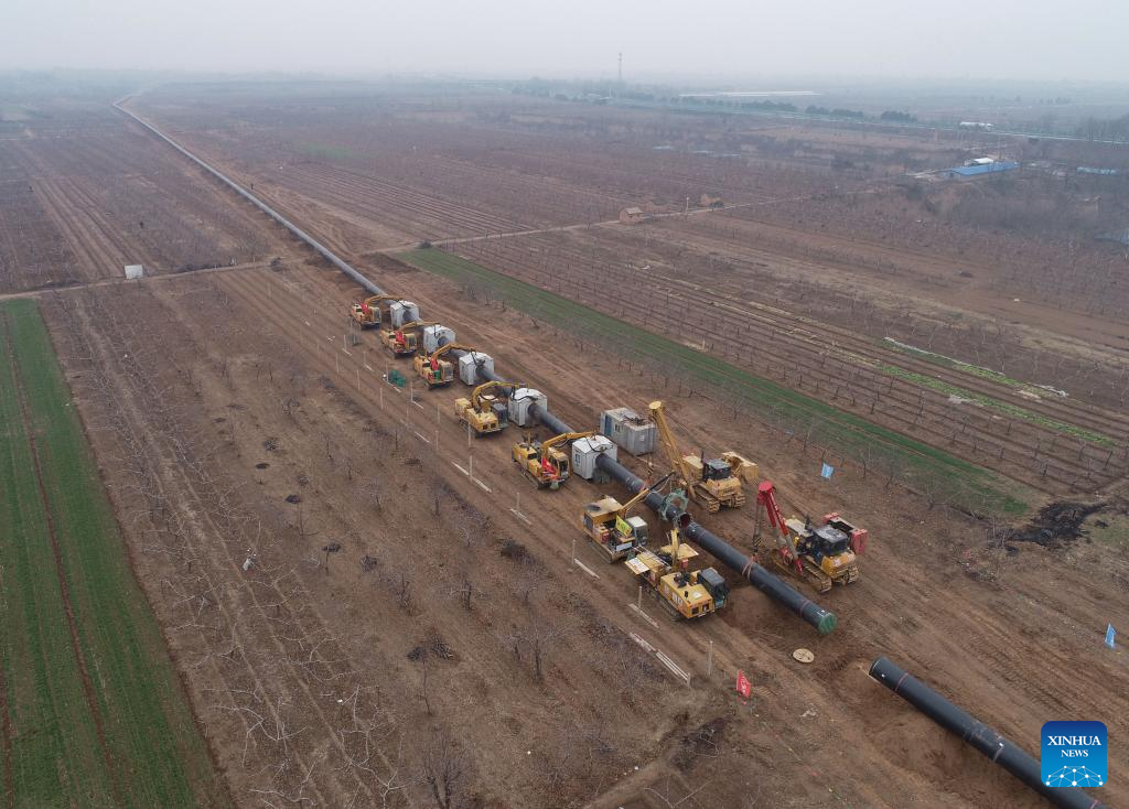 This aerial photo taken on Feb. 16, 2023 shows a view of a construction site of the Shaanxi section of the third West-to-East natural gas pipeline in Liquan County, Xianyang City of northwest China's Shaanxi Province. China's west-to-east gas transmission project has boosted natural gas supply across the country and facilitated the low-carbon transformation of the country's energy consumption structure. (Xinhua/Zhang Bowen)