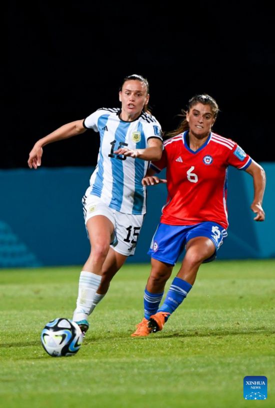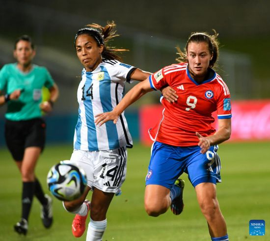 Yamila Rodriguez (R) of Argentina vies with Isidora Olave of Chile during a friendly women's football match between Argentina and Chile at the North Harbour Stadium in Auckland, New Zealand, Feb. 17, 2023. (Xinhua/Guo Lei)