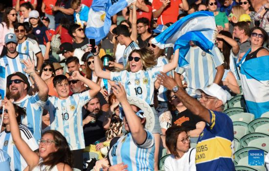 Fans are seen during a friendly women's football match between Argentina and Chile at the North Harbour Stadium in Auckland, New Zealand, Feb. 17, 2023. (Xinhua/Guo Lei)