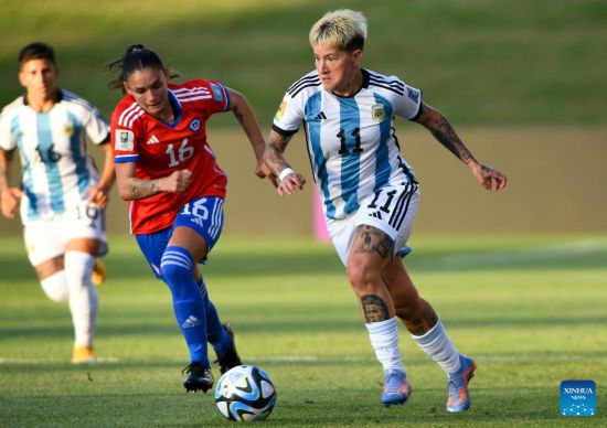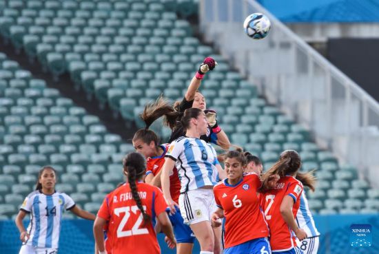 Players of both teams vie for the ball during a friendly women's football match between Argentina and Chile at the North Harbour Stadium in Auckland, New Zealand, Feb. 17, 2023. (Xinhua/Guo Lei)