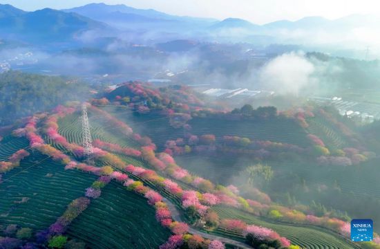 This aerial photo taken on Feb. 17, 2023 shows the scenery of cherry blossoms at a tea garden in Yongfu Town of Zhangping City, southeast China's Fujian Province. (Xinhua/Wei Peiquan)