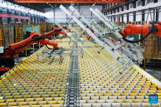 This photo taken on Feb. 17, 2023 shows robot arms working on a production line at a glass factory in Jiamusi, northeast China's Heilongjiang Province. (Xinhua/Wang Jianwei)