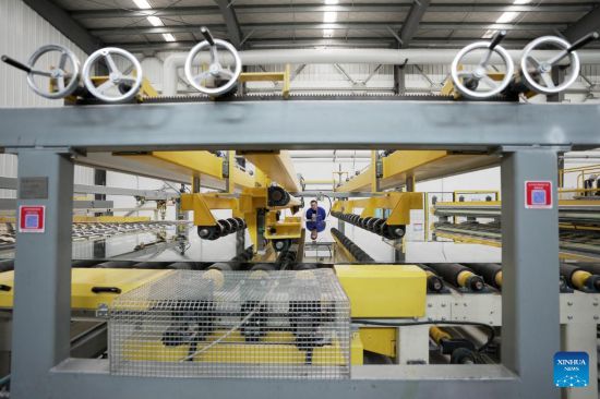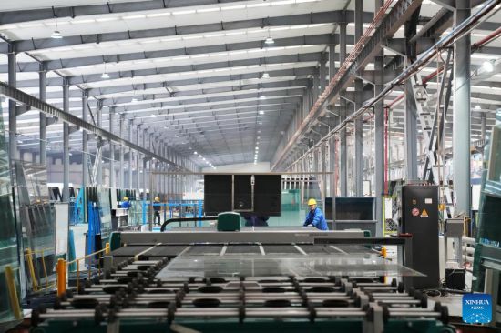 An employee inspects a production line at a glass factory in Jiamusi, northeast China's Heilongjiang Province, Feb. 17, 2023. (Xinhua/Wang Jianwei)