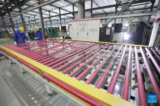 Employees work on a production line at a glass factory in Jiamusi, northeast China's Heilongjiang Province, Feb. 17, 2023. (Xinhua/Wang Jianwei)