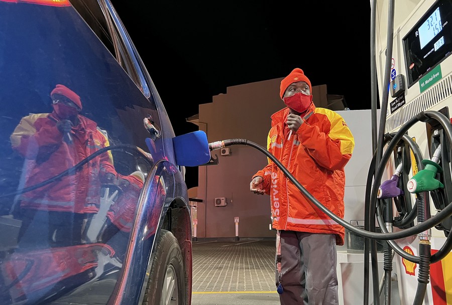 A staff member fuels a vehicle at a gas station in Windhoek, Namibia, on May 31, 2022. (Xinhua/Chen Cheng)