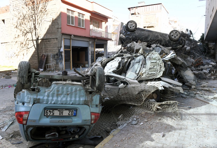 This photo taken on Feb. 18, 2023 shows damaged vehicles in Adiyaman, Türkiye. (Photo by Mustafa Kaya/Xinhua)