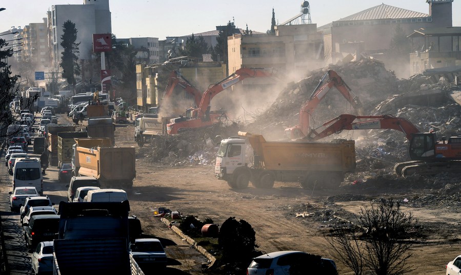 Excavators clear earthquake debris in Adiyaman, Türkiye, Feb. 18, 2023. (Photo by Mustafa Kaya/Xinhua)