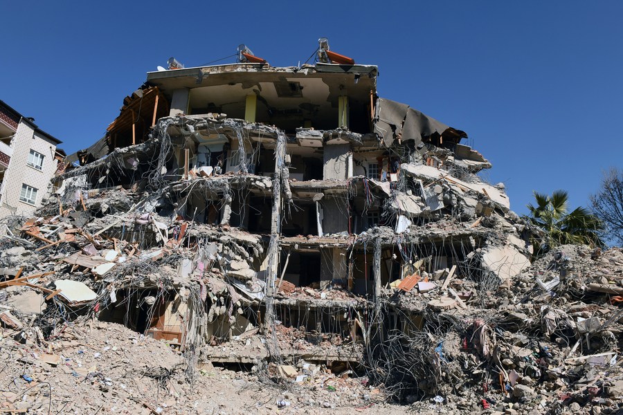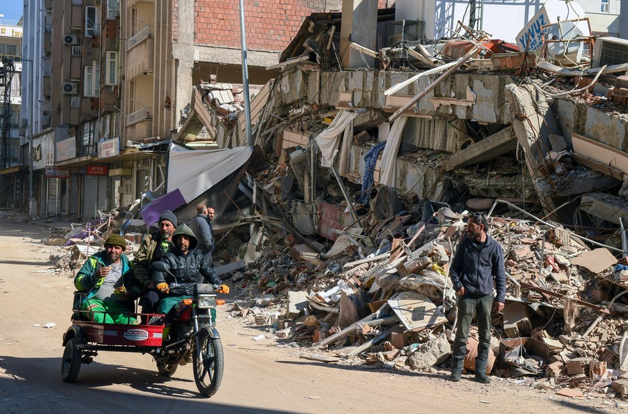 People pass by a collapsed building in Adiyaman, Türkiye, Feb. 18, 2023. (Photo by Mustafa Kaya/Xinhua)