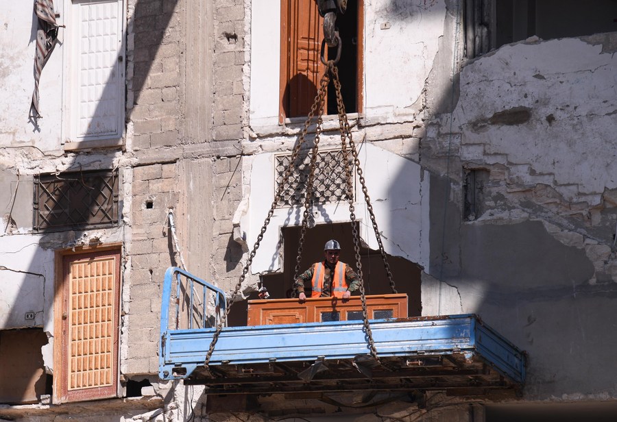 A worker transfers furniture from a residential building that was damaged during the earthquake in Hama, central Syria, on Feb. 18, 2023.(Str/Xinhua)