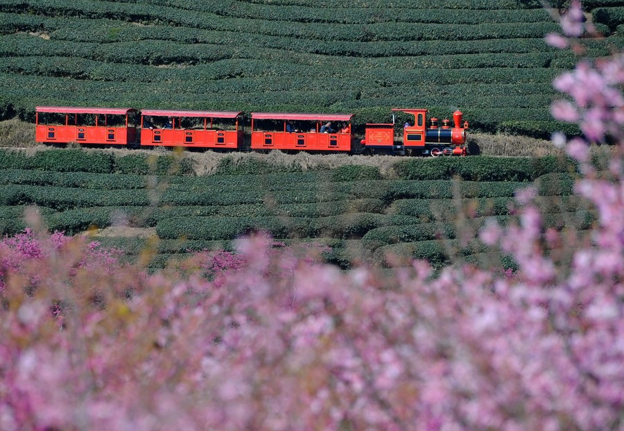 Tourists take a sightseeing train at a tea garden in Yongfu Town of Zhangping City, southeast China's Fujian Province, Feb. 17, 2023. (Xinhua/Wei Peiquan)