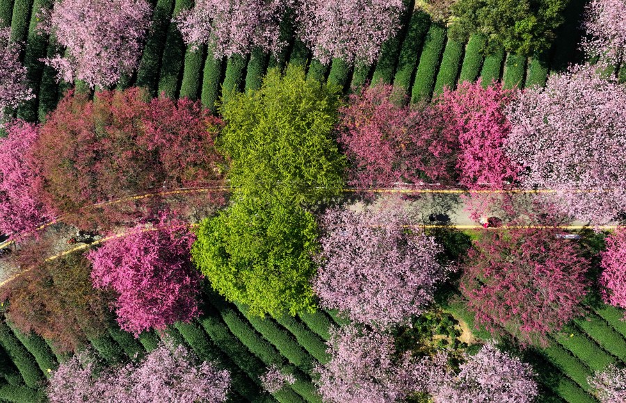 This aerial photo taken on Feb. 17, 2023 shows the scenery of cherry blossoms at a tea garden in Yongfu Town of Zhangping City, southeast China's Fujian Province. (Xinhua/Wei Peiquan)