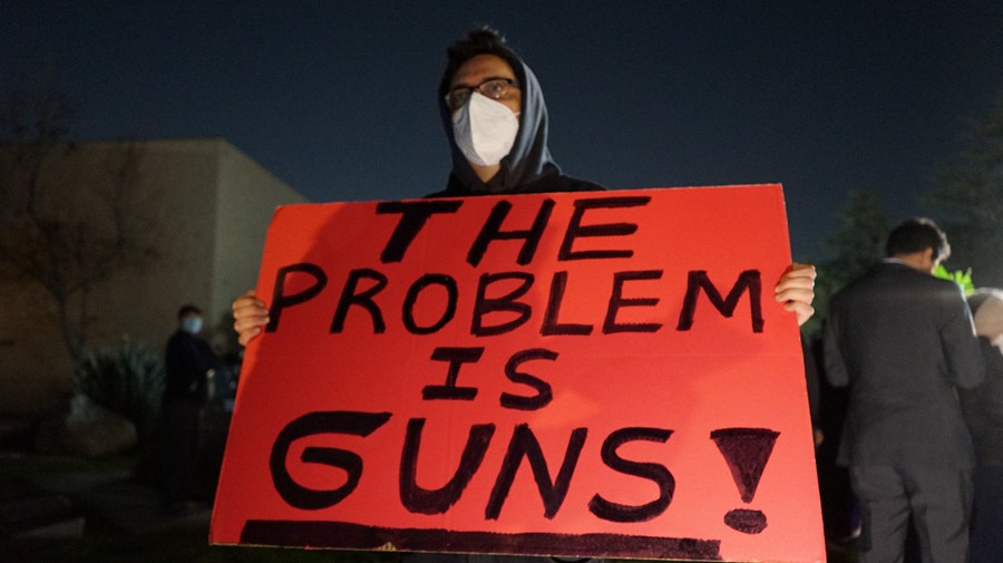 A man holds up a sign denouncing gun violence during a memorial for victims of a mass shooting at Monterey Park City Hall, California, the United States, Jan. 23, 2023. (Photo by Zeng Hui/Xinhua)