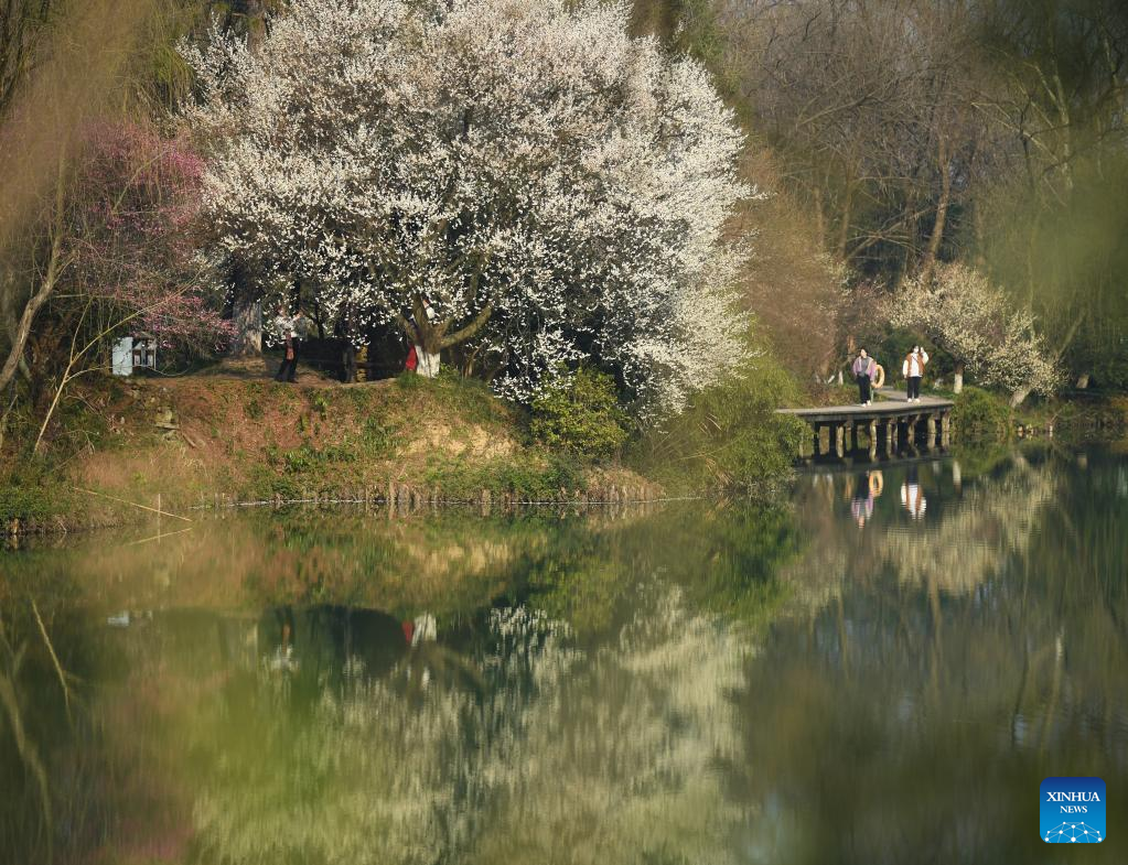 Tourists enjoy plum blossoms in the Xixi National Wetland Park in Hangzhou, east China's Zhejiang Province, on Feb. 18, 2023. As temperatures rise, more than 20,000 plum trees are in full bloom in the Xixi National Wetland Park, attracting crowds of tourists. (Xinhua/Weng Xinyang)
