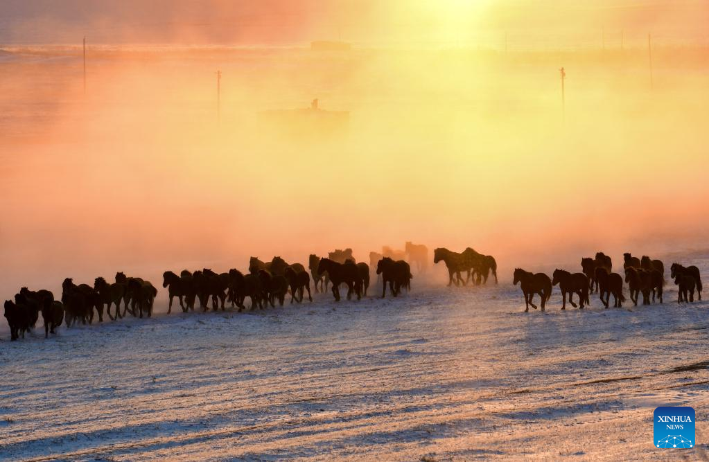 Horses gallop on a snow-covered grassland in Holin Gol, north China's Inner Mongolia Autonomous Region, Feb. 18, 2023. (Photo by Wang Zheng/Xinhua)
