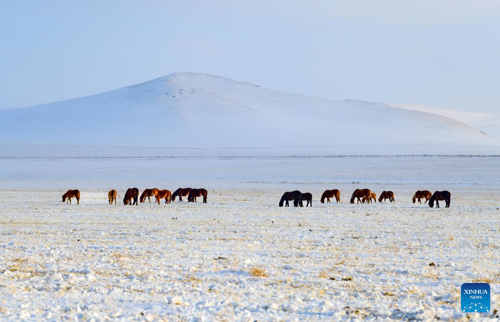 Horses forage on a snow-covered grassland in Holin Gol, north China's Inner Mongolia Autonomous Region, Feb. 18, 2023. (Photo by Wang Zheng/Xinhua)