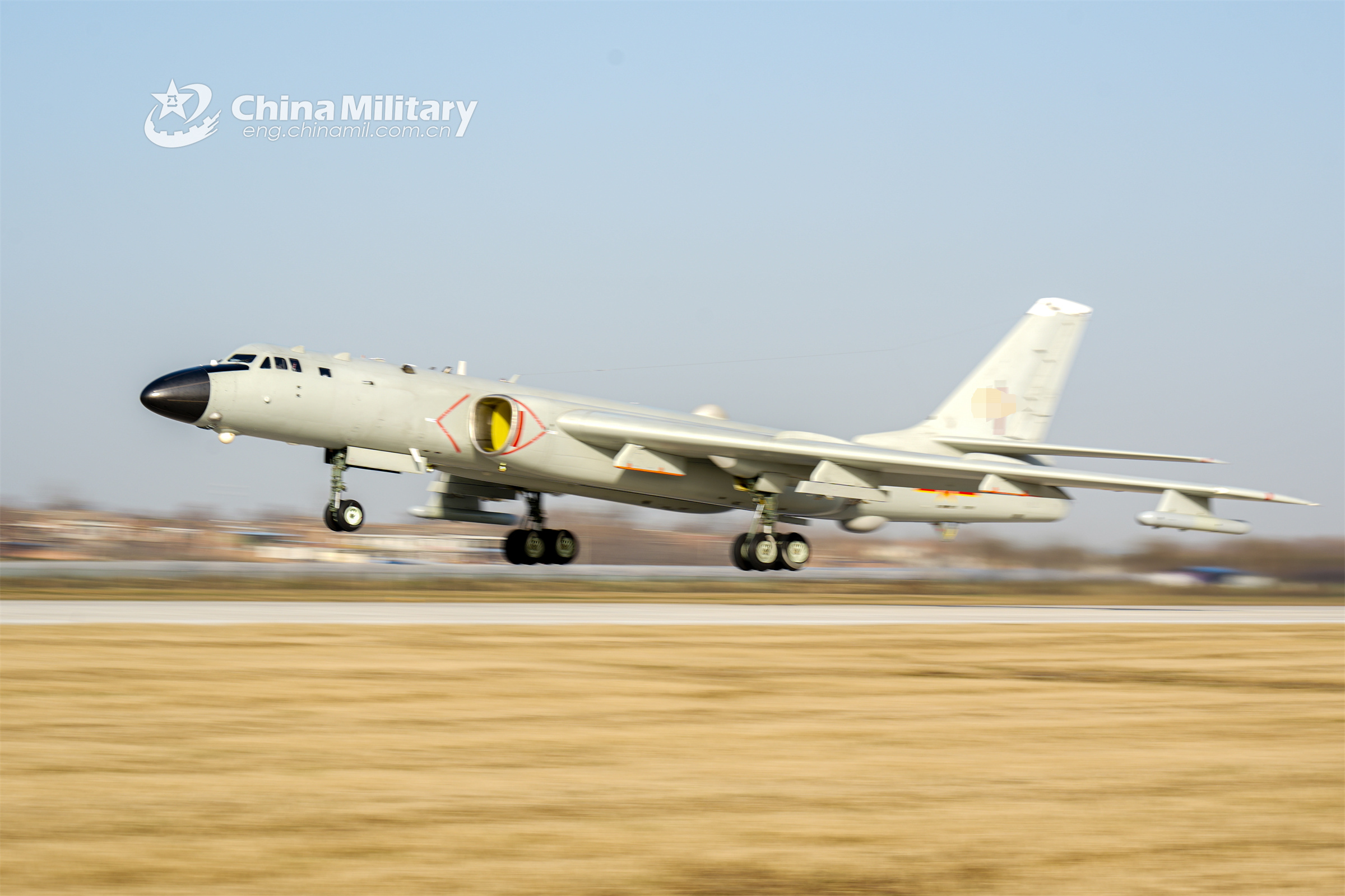 A bomber attached to an aviation regiment of the air force under the PLA Central Theater Command takes off from the runway during a flight training exercise in early February, 2023. (eng.chinamil.com.cn/Photo by He Shilong)