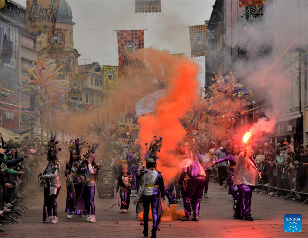 This photo taken on Feb. 19, 2023 shows the carnival parade, the culmination of the month-long Rijeka Carnival in Rijeka, Croatia. (Xinhua/Li Xuejun)