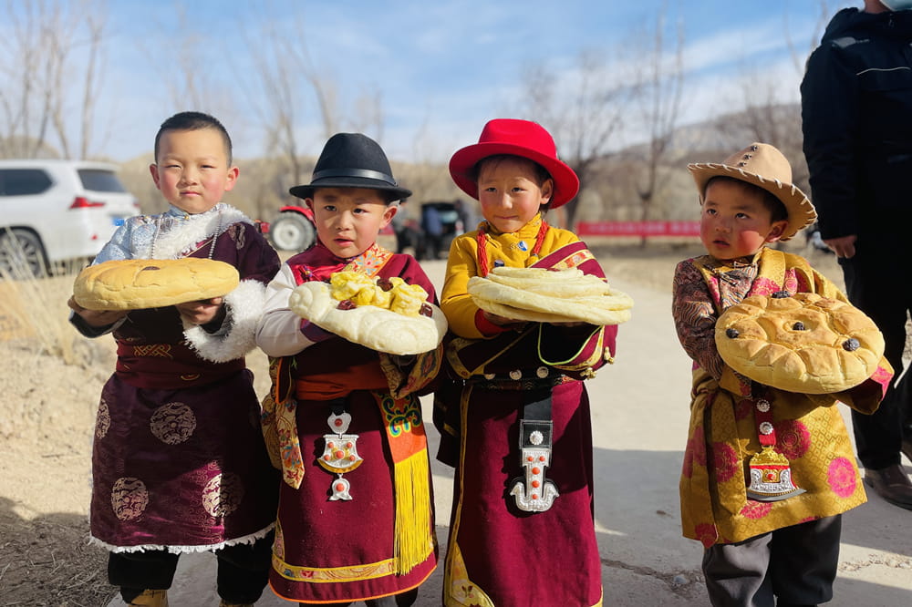 Children hold steamed buns to celebrate the start of spring farming in Guide county, Tibetan Autonomous Prefecture of Hainan, northwest China’s Qinghai Province. (Photo/Publicity Department of CPC Hainan Tibetan Autonomous Prefecture Committee)