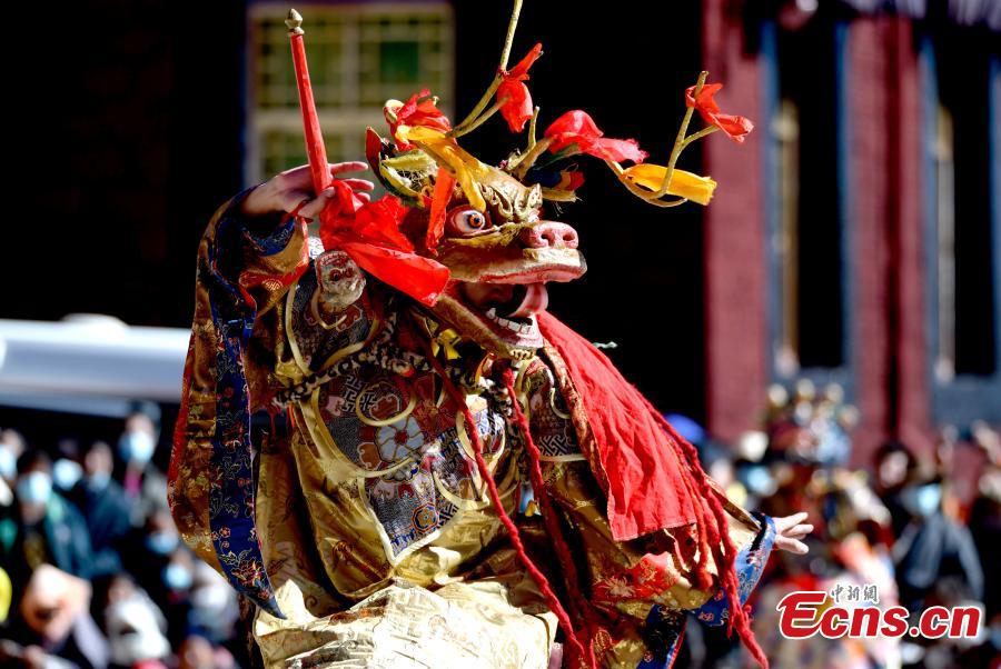A monk performs Cham dance to greet the Tibetan New Year at the Tsurphu Monasteryin Lhasa, southwest China's Tibet Autonomous Region, Feb. 19, 2023. (Photo: China News Service/Li Lin)