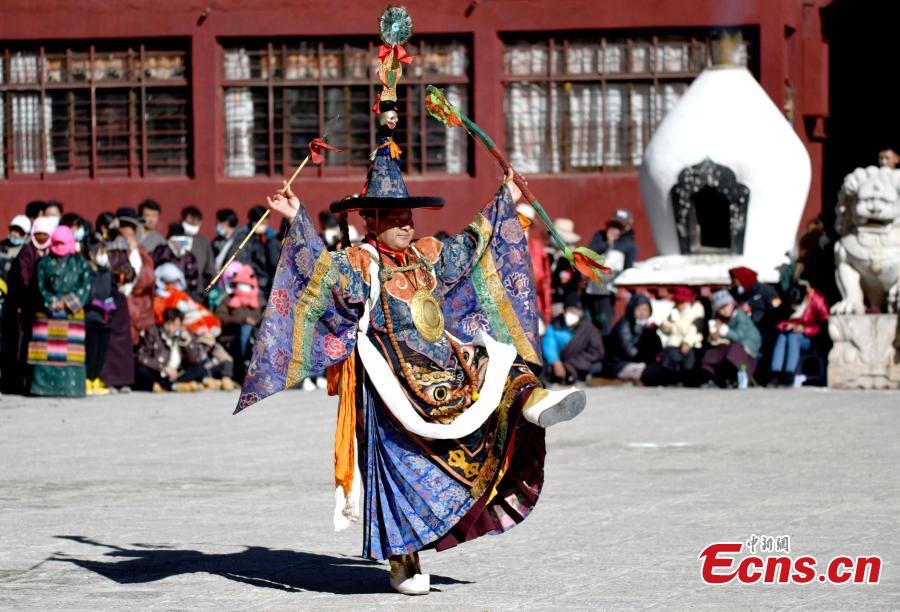 A monk performs Cham dance to greet the Tibetan New Year at the Tsurphu Monasteryin Lhasa, southwest China's Tibet Autonomous Region, Feb. 19, 2023. (Photo: China News Service/Li Lin)