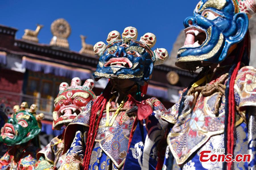 Monks perform Cham dance to greet the Tibetan New Year at the Tsurphu Monasteryin Lhasa, southwest China's Tibet Autonomous Region, Feb. 19, 2023. (Photo: China News Service/Li Lin)