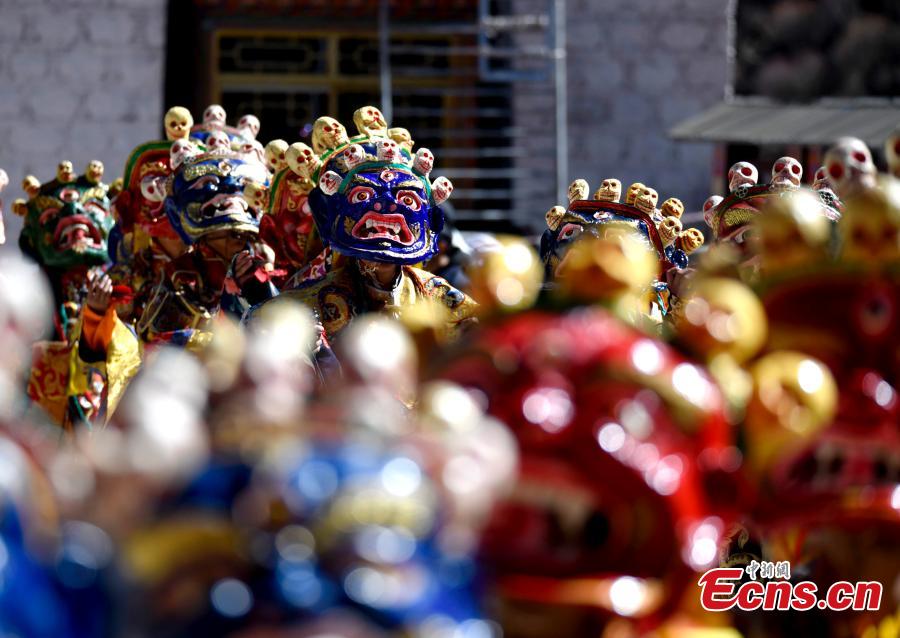Monks perform Cham dance to greet the Tibetan New Year at the Tsurphu Monasteryin Lhasa, southwest China's Tibet Autonomous Region, Feb. 19, 2023. (Photo: China News Service/Li Lin)