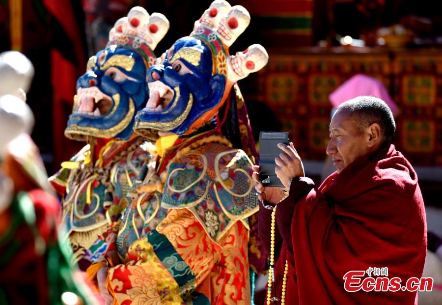 Monks perform Cham dance to greet the Tibetan New Year at the Tsurphu Monasteryin Lhasa, southwest China's Tibet Autonomous Region, Feb. 19, 2023. (Photo: China News Service/Li Lin)