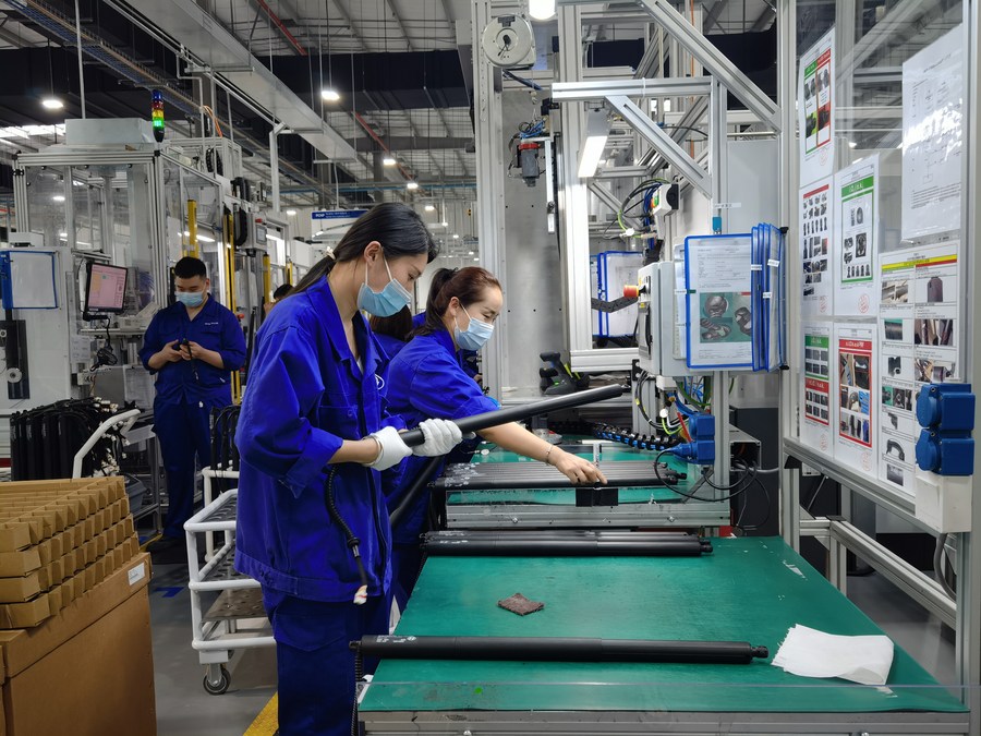 Employees work at a workshop of gas springs manufacturer Stabilus (Zhejiang) Co., Ltd. in Pinghu, east China's Zhejiang Province, April 19, 2022. (Xinhua/Yin Xiaosheng)