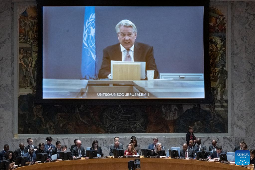 UN Special Coordinator for the Middle East Peace Process Tor Wennesland (L, on the screen) speaks via a video link at a Security Council meeting at the UN headquarters in New York, on Feb. 20, 2023. Wennesland on Monday voiced concern over a surge of violence between Israelis and Palestinians. (Eskinder Debebe/UN Photo/Handout via Xinhua)