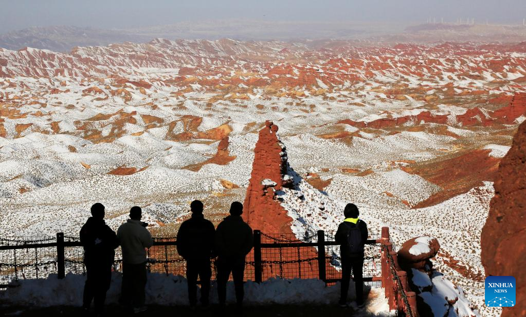 Tourists view the snow scenery of Pingshanhu Canyon in Zhangye City, northwest China's Gansu Province, Feb. 20, 2023. (Photo by Chen Li/Xinhua)
