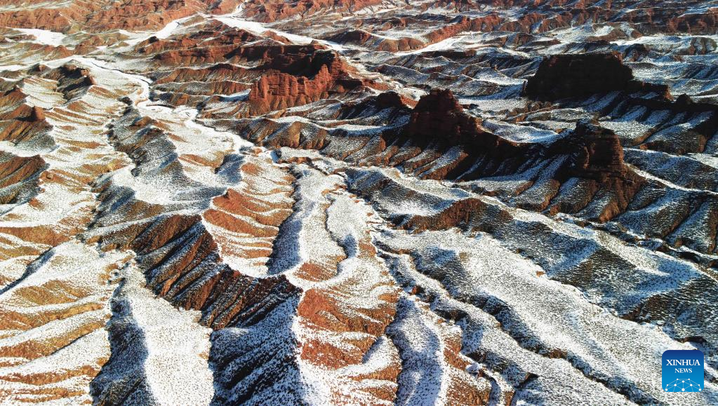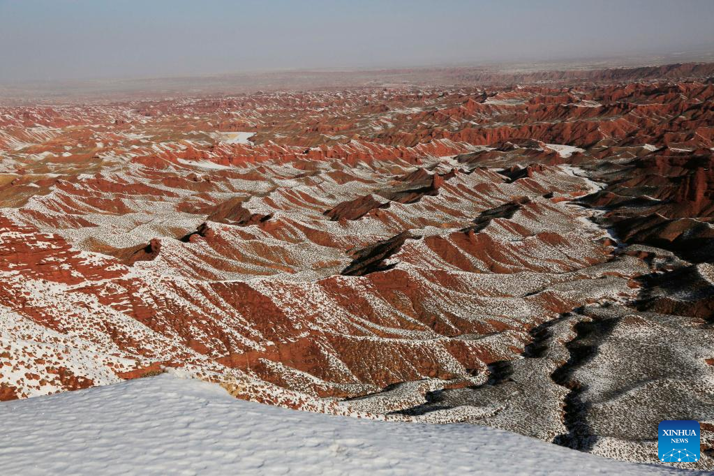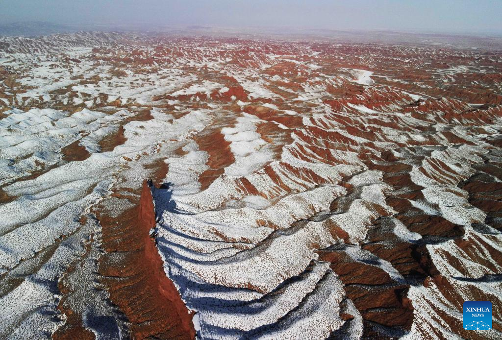 This aerial photo taken on Feb. 20, 2023 shows the snow scenery of Pingshanhu Canyon in Zhangye City, northwest China's Gansu Province. (Photo by Chen Li/Xinhua)