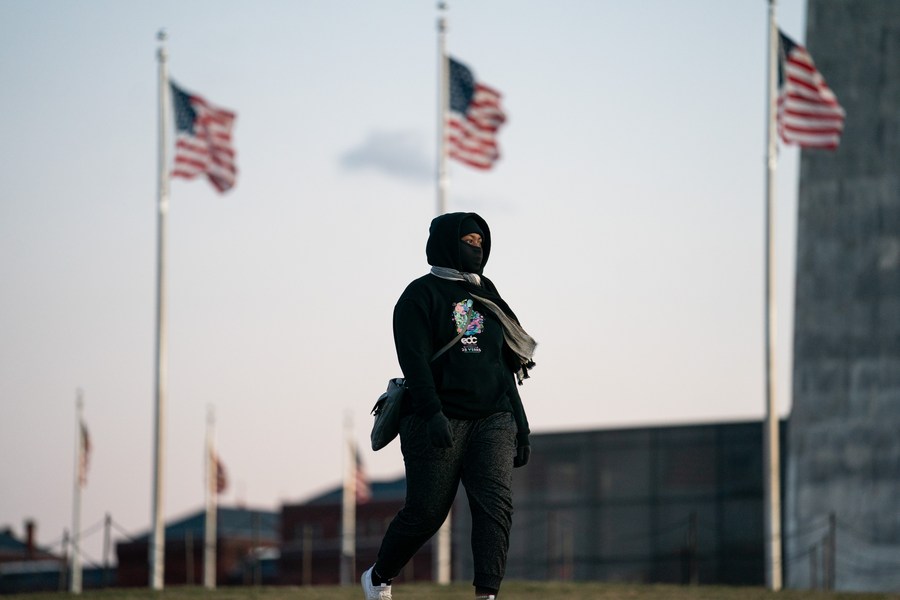 A woman visits the National Mall amid low temperatures and strong winds in Washington, D.C., the United States, Feb. 3, 2023. (Xinhua/Liu Jie)