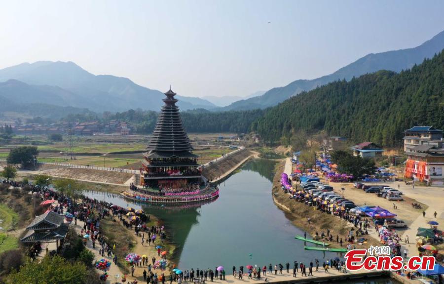 Villagers of Miao ethnic group dance with Lusheng, a reed-pipe wind instrument, to celebrate Er Yue Er (Dragon Head Raising Day) in Dongtou town, Rongshui Miao Autonomous County, south China's Guangxi Zhuang Autonomous Region, Feb. 20, 2023. (Photo: China News Service/Long Linzhi)