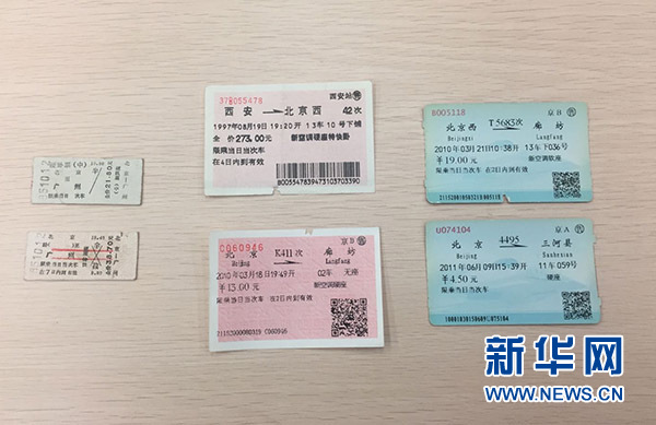 Photo shows train tickets of different times. (Photo/Xinhua)