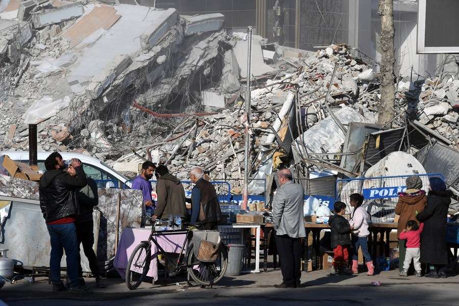 People are seen near the rubble of a destroyed building in the quake-hit city of Adiyaman, Türkiye, on Feb. 20, 2023. (Photo by Mustafa Kaya/Xinhua)