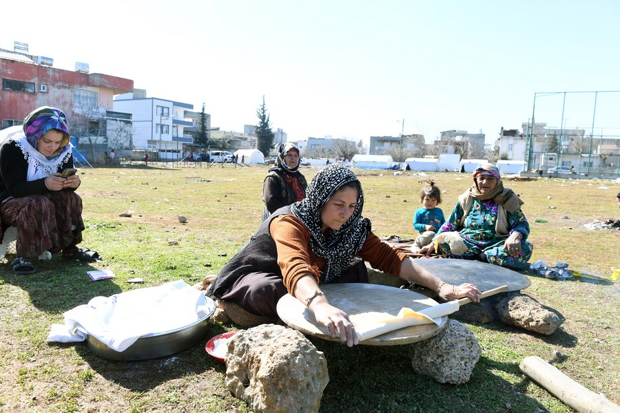 A displaced woman makes bread in the quake-hit city of Adiyaman, Türkiye, on Feb. 20, 2023. (Photo by Mustafa Kaya/Xinhua)