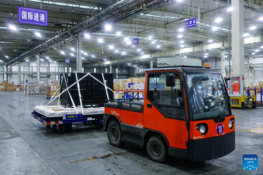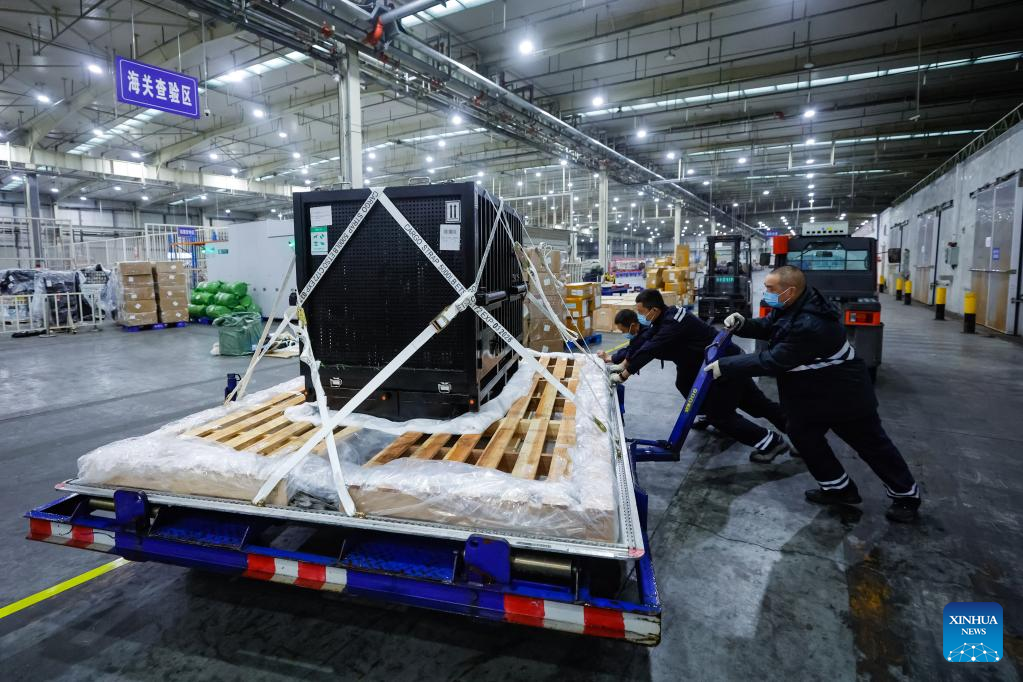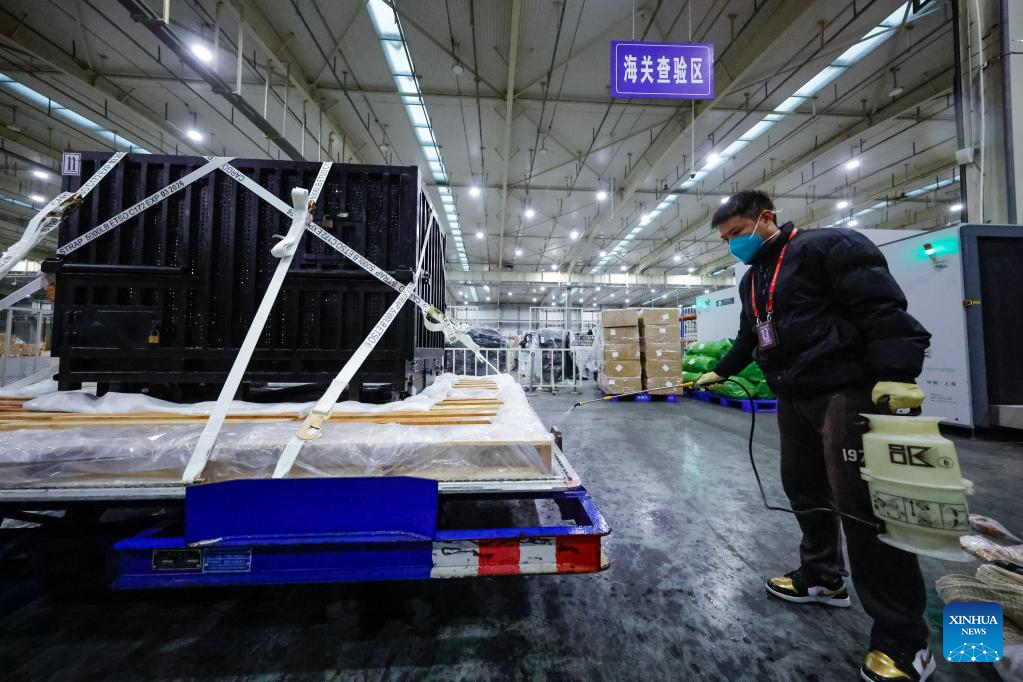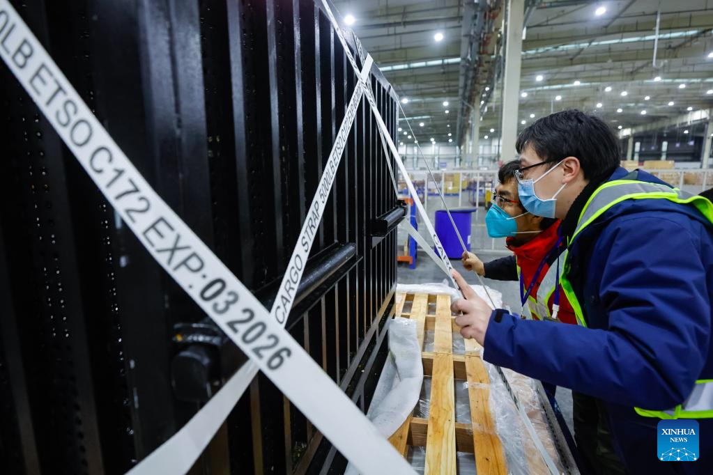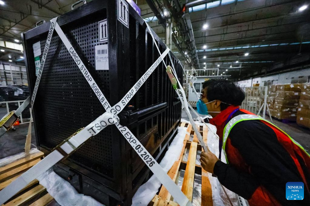 Customs officers supervise the unloading of the Japan-born giant panda Xiang Xiang at Chengdu Shuangliu International Airport in southwest China's Sichuan Province, Feb. 21, 2022. (Xinhua/Shen Bohan)