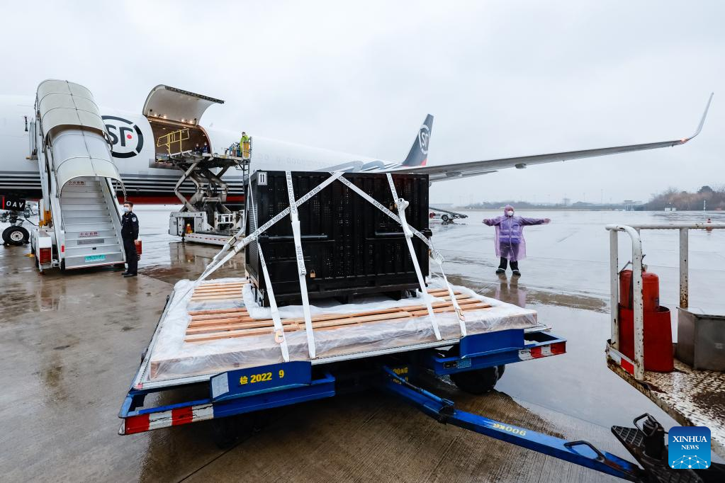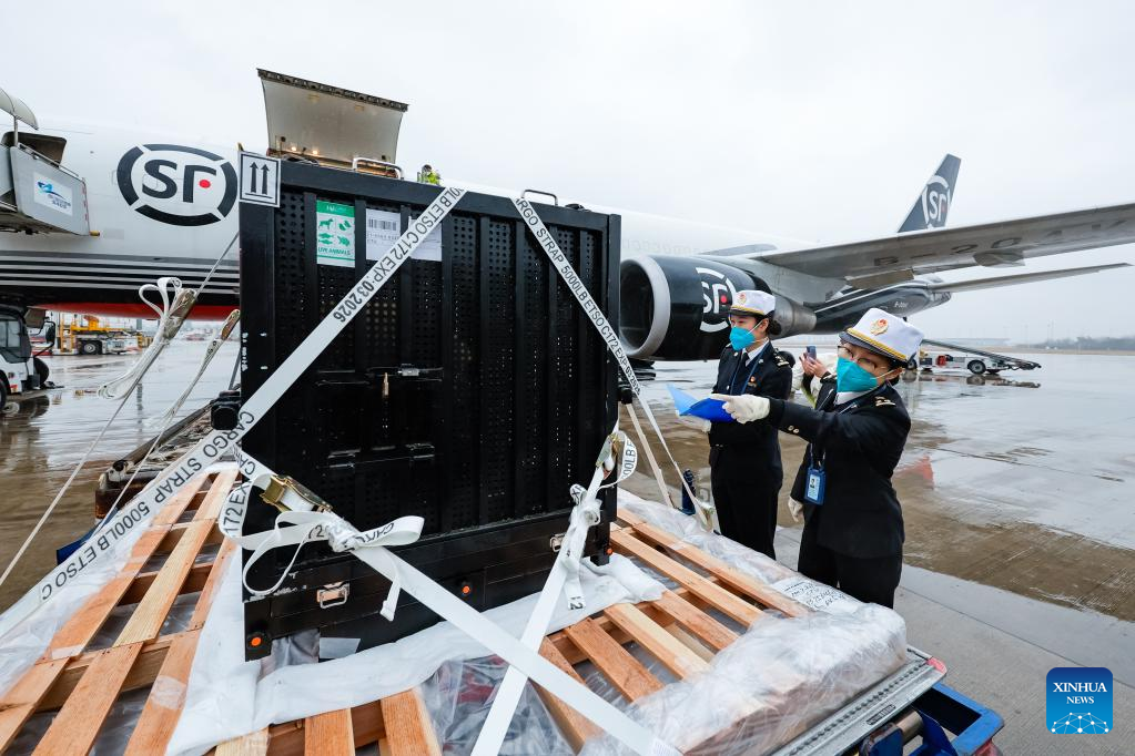 The Japan-born giant panda Xiang Xiang arrives at Chengdu Shuangliu International Airport in southwest China's Sichuan Province, Feb. 21, 2022. (Xinhua/Shen Bohan)