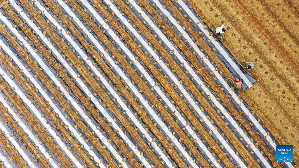 This aerial photo taken on Feb. 18, 2023 shows villagers working at a vegetable base in Duanqiao Town of Guanling Buyi and Miao Autonomous County, southwest China's Guizhou Province. Yushui (Rain Water), the second of China's 24 solar terms, falls on Feb. 19 in the year 2023. The arrival of Yushui will see rises in temperature, more frequent rainfall, and a wave of spring farming activities across China. (Xinhua/Yang Ying)