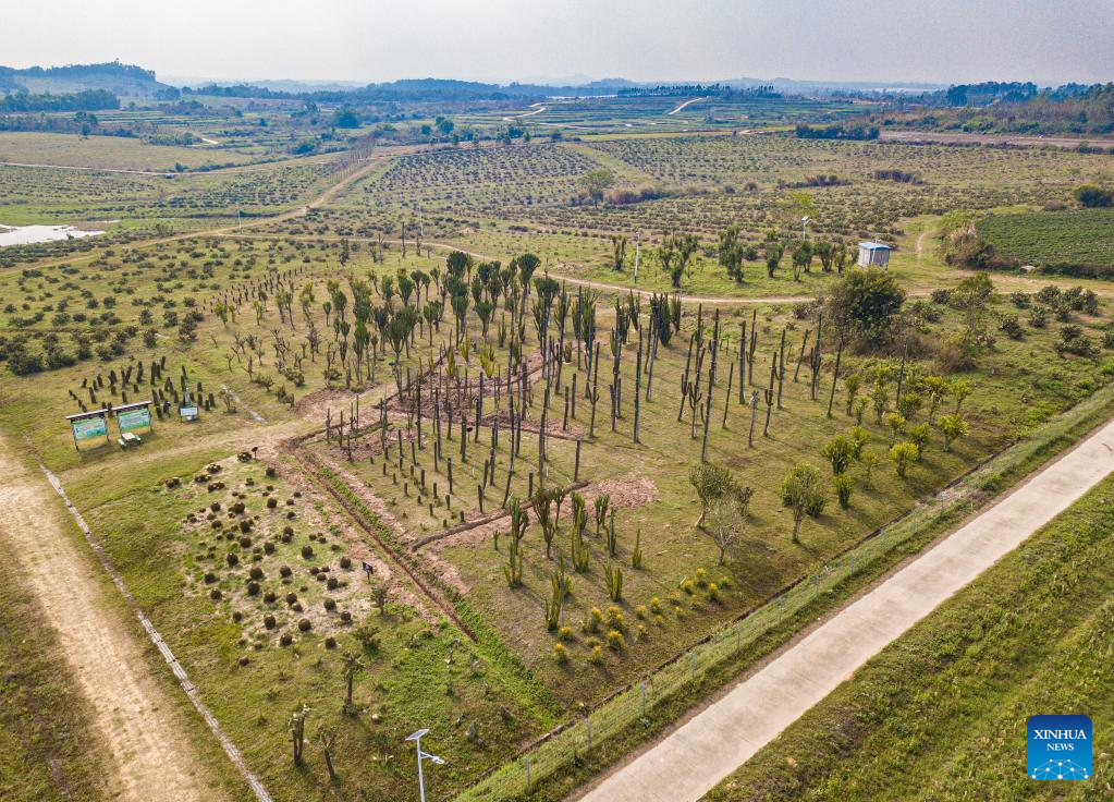 This aerial photo taken on Feb. 20, 2023 shows a cactus planting base in Danzhou, south China's Hainan Province. This cactus planting base covers an area of more than 1,300 mu (about 86 hectares). It has integrated agriculture, technology and tourism to boost local employment and economy. (Xinhua/Pu Xiaoxu)