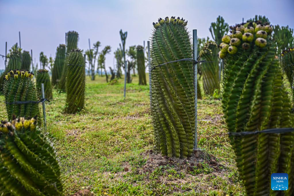 This photo taken on Feb. 20, 2023 shows ornamental cacti grown at a cactus planting base in Danzhou, south China's Hainan Province. This cactus planting base covers an area of more than 1,300 mu (about 86 hectares). It has integrated agriculture, technology and tourism to boost local employment and economy. (Xinhua/Pu Xiaoxu)